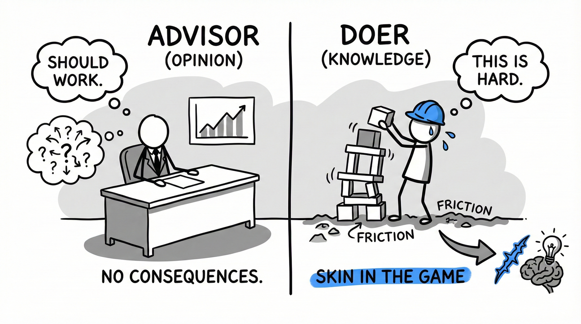This learning rewires intuition. The doer develops pattern recognition that the advisor never acquires because the advisor's mental models are never stress-tested by consequences.