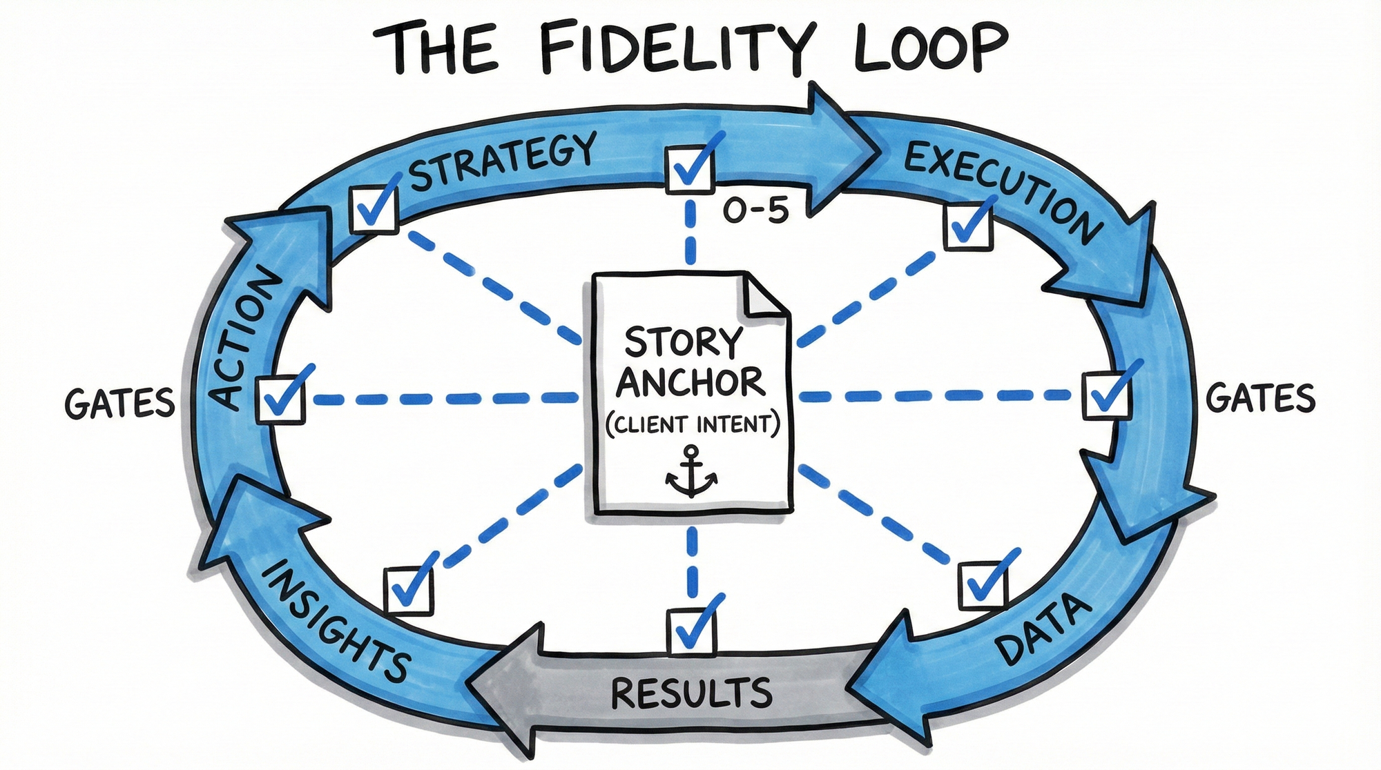 Every new project restarts the loop. Every strategic pivot triggers Gate 0 again. Every new stakeholder resets the fidelity chain.