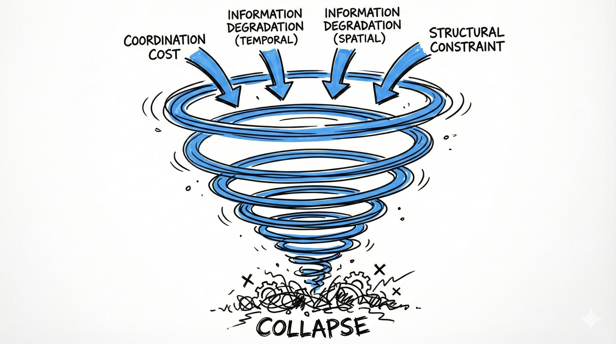 Third law violated: Spatial Information Degradation. The organization grows faster than information can flow through it. Teams execute something different than what was intended.