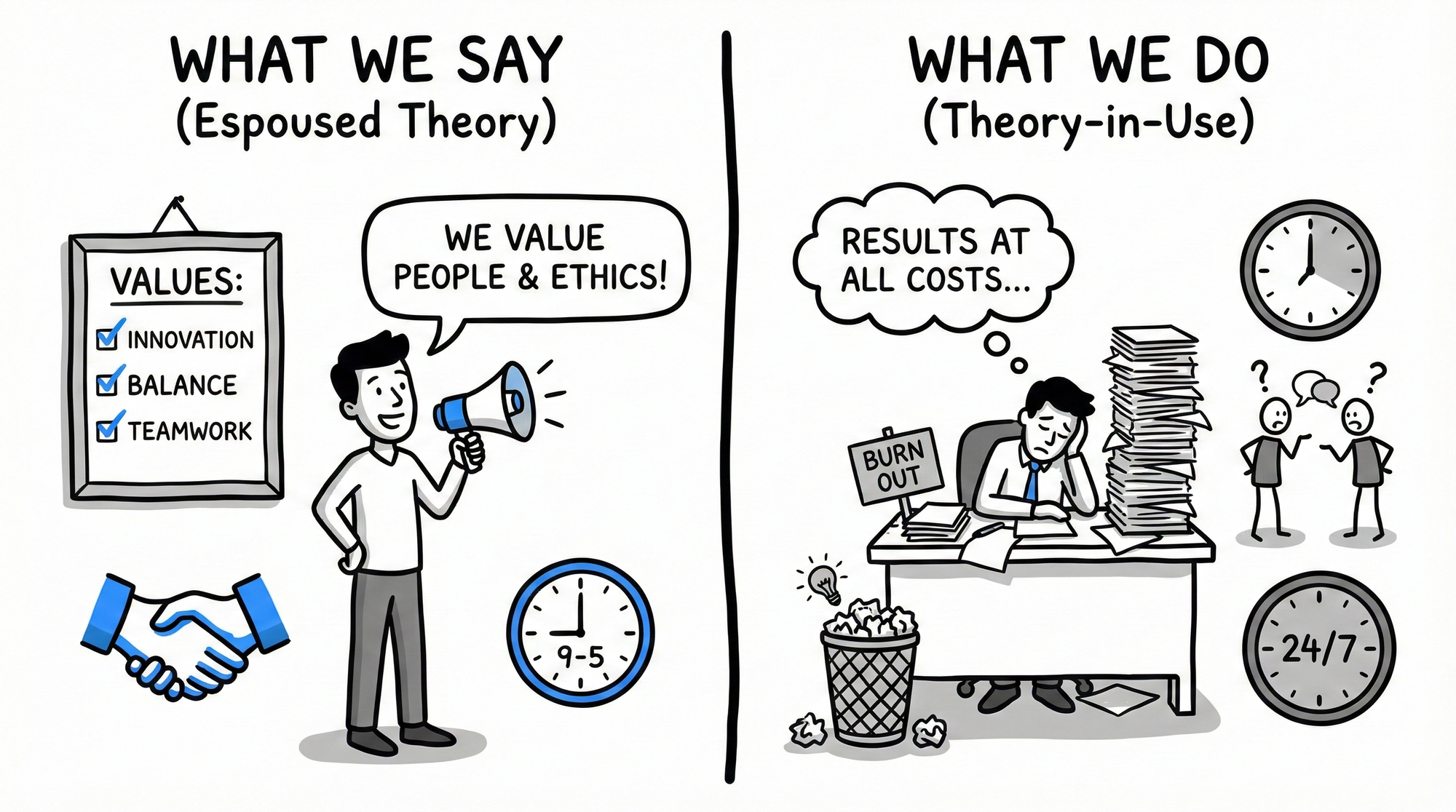 Argyris called this "skilled incompetence." We're highly skilled at maintaining the illusion of alignment. We're incompetent at seeing the gap.