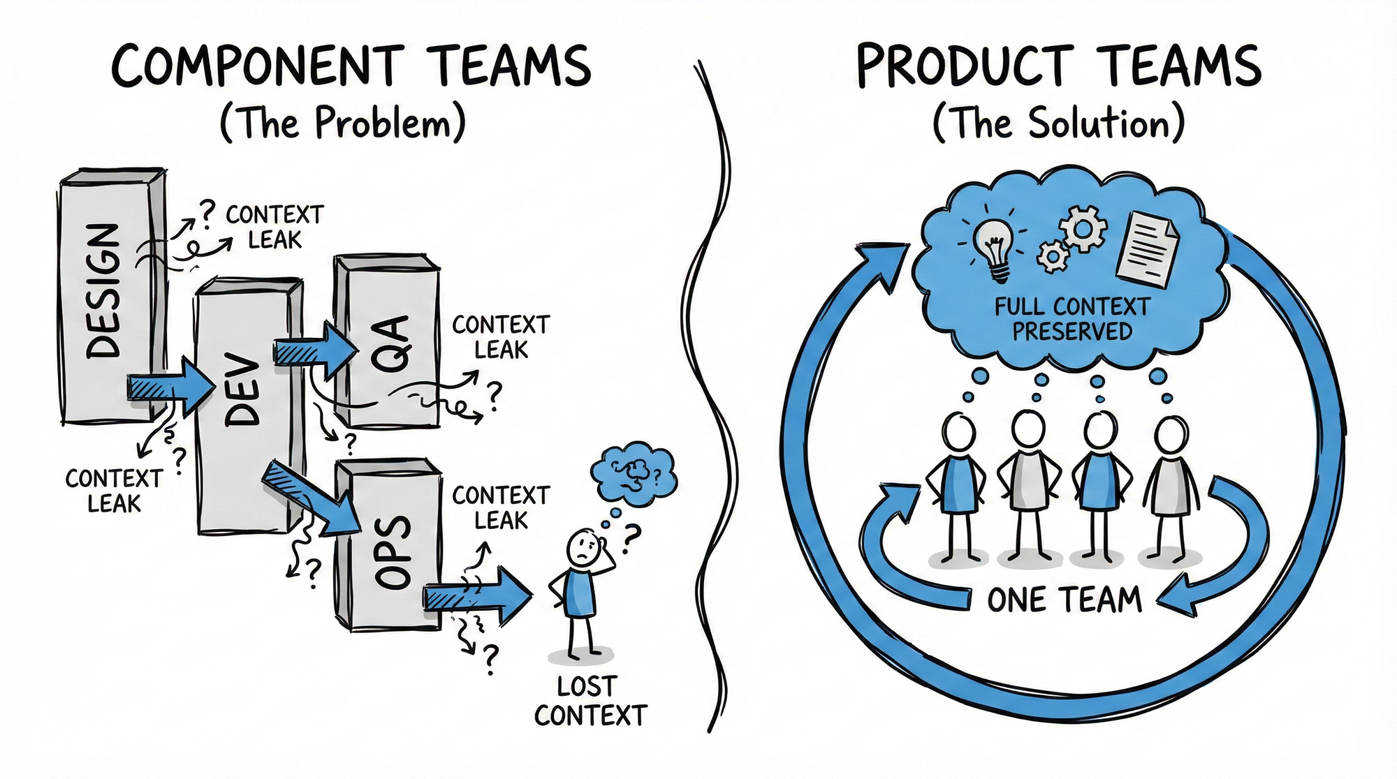 This is why product teams outperform component teams. A component team does one part of the work: the frontend, or the backend, or the database layer. Work flows between teams. Each flow is a handoff. Each handoff loses context.